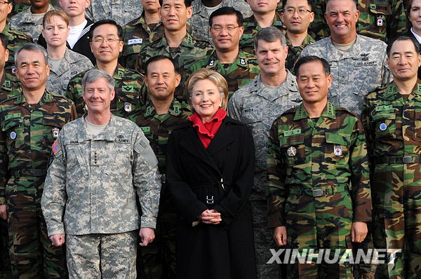 2月20日,在韓國龍山駐韓美軍基地,美國國務(wù)卿希拉里(前排中)與駐韓美軍司令(前排左)夏普及韓美軍官合影。