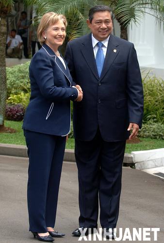 2月19日,在印度尼西亞首都雅加達(dá)總統(tǒng)府,印尼總統(tǒng)蘇西洛(右)會見到訪的美國國務(wù)卿希拉里。新華社記者岳月偉攝