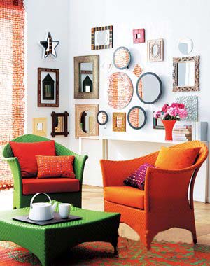 旅行時收集的裝飾框,不必為風(fēng)格、材質(zhì)和顏色的沖突而擔(dān)心,把它們鑲嵌上鏡子,集中展示在墻面上,保證成為居室中的亮點。