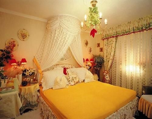 臥室中既然以床為中心了,其它飾物一般就應(yīng)有“退居二線”的 襯托意識。如窗簾,面積較大,太艷、太豪華了,就會(huì)與床飾形成兩個(gè)“中心”,以至讓人眼花 繚亂。故窗簾應(yīng)選用相應(yīng)一點(diǎn)兒的色彩、圖案、面料,像一個(gè)“仆人”站在床邊。