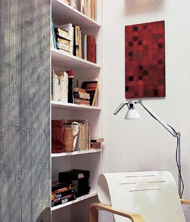 大型衣柜一側(cè)的白色書架延續(xù)客廳書架的收納方法,避免了整面墻的擁堵感,令視覺(jué)效果更為豐富。在白色書架旁邊, 安排了一條同客廳一樣的灰色木質(zhì)墻飾,成為豐富墻面表情的細(xì)致之舉。一張椅、一盞落地?zé)?、一幅紅色的裝飾畫,為臥室?guī)?lái)安靜氣氛。