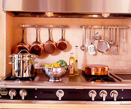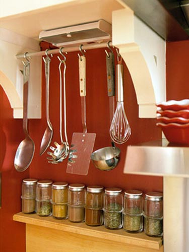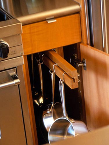 如果墻壁或天花等不能安裝掛桿或支架,則可以考慮在櫥柜里安一個可抽拉的懸掛式掛桿。用來懸掛勺子、舀子等用具。
