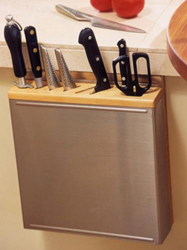 把刀具等利器放在一個不銹鋼的盒子里。盒子可以固定在柜臺的一側(cè)。如果家里有小孩子,那盒子最好安在櫥柜門的內(nèi)側(cè)。