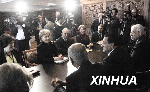 3月2日,埃及總統(tǒng)穆巴拉克(前右二)在埃及海濱城市沙姆沙伊赫會見來訪的美國國務(wù)卿希拉里(左二)。雙方隨后出席了加沙重建國際會議。 新華社記者張寧攝