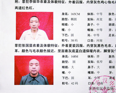 據(jù)陜西省漢中監(jiān)獄通緝資料顯示,兩名越獄的罪犯其中一人名叫李保華,又名李寶華、李寶,1972年2月2日生于河南省焦作市,小學(xué)文化,家住河南省焦作市溫縣北平皋村三組,原租住寶雞市新維巷49號,是個體裝修工人。2006年10月15日,因販賣毒品罪被寶雞市中級人民法院判處無期徒刑,2007年9月5日送漢中監(jiān)獄服刑。另一罪犯名叫張國顯,1971年3月26日出生,小學(xué)文化,是河南省上蔡縣人,農(nóng)民,住上蔡縣東岸鄉(xiāng)中興村張莊15號。2007年3月9日因搶劫罪被西安市中級人民法院判處無期徒刑,2007年9月30日送漢中監(jiān)獄服刑。