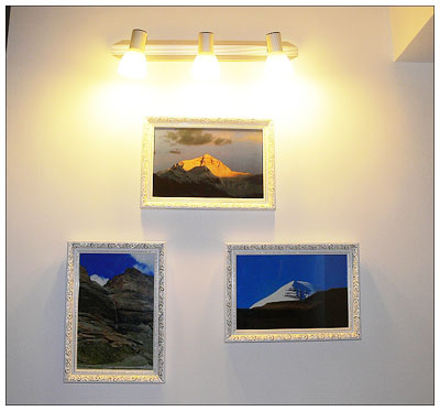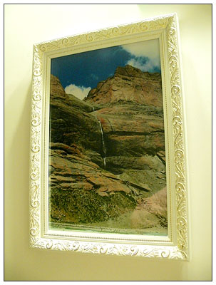 這里可以窺見爸爸的電腦工作臺(藏在大墻柜里面的),還有他房間上面的得意之作,九寨溝的瀑布,金色相框燈照效果輝煌的說,我總是遺憾青山碧水可惜沒有配上**的藍(lán)天。