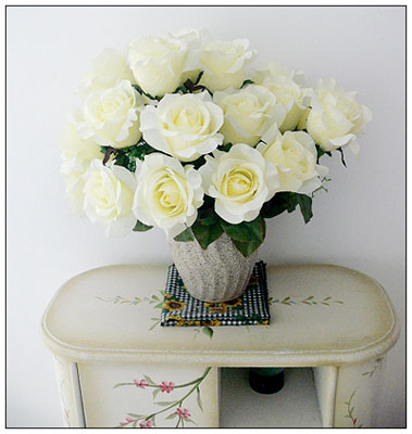柜上擺設(shè)的花瓶和花都采購自花卉市場,花瓶顏色低調(diào),而且價(jià)錢也不貴。花束采自花卉市場的婚宴小店,淡淡的淺黃色熱烈盛放,9元一束買了3束,無論是白天還是夜間,要非常仔細(xì)辨認(rèn)才看得出是仿真花哦。