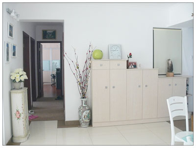 過道全景,進(jìn)門直通的通道對著墻。高低有致的是訂做的鞋柜。市面上賣的鞋柜老貴,而且規(guī)格還不太適合偶家,于是訂了一個(gè),整套打造1400多,省錢之余還利用空間。