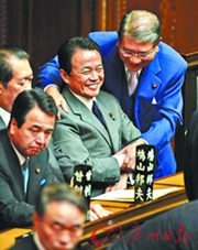 日本共同社援引民主黨議員的話說,自民黨可能“一下子轉守為攻”。一名曾擔任內(nèi)閣成員的自民黨議員建議,麻生應抓住這一良機,提前解散眾議院,舉行選舉。