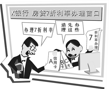 除各家銀行態(tài)度模糊外,同一銀行各個(gè)支行間執(zhí)行的政策也往往不一樣。重慶市民陽(yáng)女士和郭先生在同一家單位工作,兩人分別在農(nóng)業(yè)銀行沙坪壩支行和加州支行辦理了房貸,但在申請(qǐng)“七折”時(shí)的“待遇”卻不相同。陽(yáng)女士被要求辦一張農(nóng)業(yè)銀行信用卡,郭先生則被要求辦理了“手機(jī)短信通知業(yè)務(wù)”、“電子口令業(yè)務(wù)”等多種附加業(yè)務(wù),為此每月得多支付不少費(fèi)用。