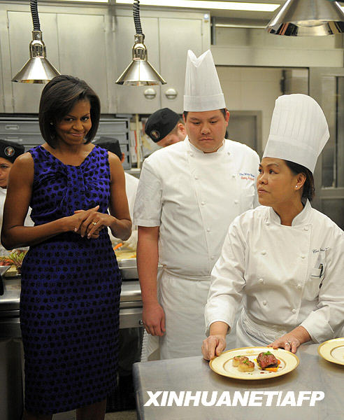 2月22日,在美國華盛頓白宮的廚房里,美國“第一夫人”米歇爾·奧巴馬(左)探望為宴請(qǐng)州長的晚餐而忙碌的廚師們。新華社/法新