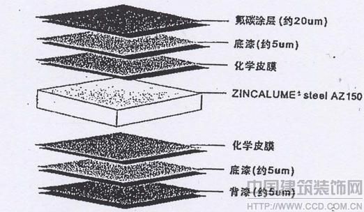 常熟市沃爾碼商業(yè)廣場項目金屬幕墻所采用的彩色鋼板為廣州博思格來實公司所生產(chǎn)的彩鋼板,其具有以下特點:彩鋼板抗腐蝕性能、防潮性能、抗粉化性能、抗化學性能均達到了一個較高水準。博思格來實公司的彩鋼板其基板為優(yōu)耐板,系鍍鋁鋅合金鍍層。涂復前進行特有的抗銹蝕化學鍍膜處理;正面底漆層,涂復厚度5μm的聚酯底漆;鋼板正面涂層采用KYNARORPVD涂層厚度為20μm;鋼板背面淺綠色涂層,其厚度為5μm;背面底漆層為5μm厚環(huán)氧基樹酯。涂層結(jié)構(gòu)如圖2。
