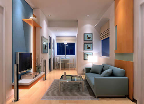 淺藍色的沙發(fā)與電視背景墻,裝飾出這個客廳小而優(yōu)雅,站在這個空間內不會給客人以壓迫感,反而顯得大方。全金屬質感的電視、影碟機、音響讓人感覺很利落精致不俗氣。純白色的墻壁和反射燈吊頂映襯出整個客廳十足的簡約現(xiàn)代風格