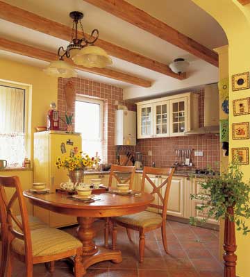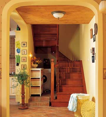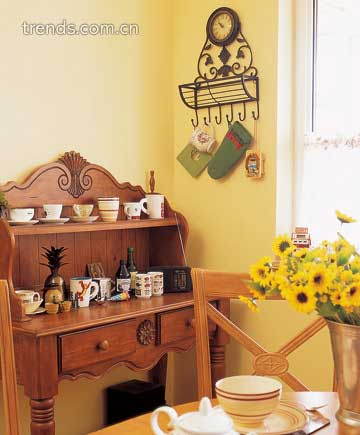 客廳左手邊的樓梯下就是開放式的餐廚空間,這里一如既往地延續(xù)著客廳地面的斑駁,不同的色彩巧妙地區(qū)分了空間。赭石色是懷舊與鄉(xiāng)村永遠(yuǎn)不變的基調(diào)。樓梯下方特別設(shè)計了壓低吊頂。這樣的設(shè)計不但不會顯得空間矮小,反而因?qū)哟蔚腻e落,使得餐廚間層高得到擴(kuò)展。KEN說當(dāng)初裝修公司是提供設(shè)計的。但是設(shè)計師的建議除了色彩其他都是他無法接受的。如果真的按照設(shè)計師的建議,在這么小的空間按照規(guī)則設(shè)計廚房操作臺,那么我們今天就無法看到這質(zhì)樸的實(shí)木大餐桌,也無法看到這些擺放可愛物品的餐邊柜了。家具的挑選是隨意的,色彩上也打破陳規(guī),用大膽的白色、黃色與深沉的胡桃木色組合。樓梯拐角的空間被設(shè)計成簡易的洗衣房,空間得到了合理的利用。草編的洗衣筐還有那樸素的編織陳列柜組合,小空間也有大用途。