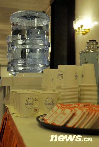 再來一張人民大會堂里供工作人員用餐的地方,“節(jié)約糧食,請勿浪費”非常醒目?。悵?攝)