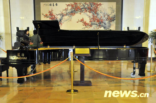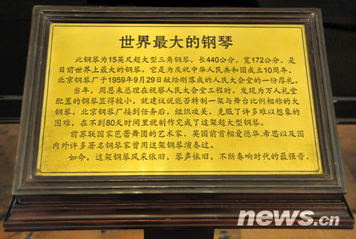 從人民大會堂東門進去后的東大廳里,展放著世界上最大的鋼琴(陳濤 攝)