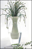 不管用什么材料,必須先確定表現(xiàn)材料的哪些部分。如果首選是線條美感,整體搭配設計要突出簡潔,例如韭菜苔和西芹有較長的葉莖,就可以利用它的外形隨意插入水中,效果極佳。此時要注意的是其它元素的平衡性,建議最好用單純的顏色或同一色系的顏色。