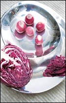 選擇的蔬果能否表現(xiàn)出美感,很大程度上取決于與容器的組合是否協(xié)調。這種協(xié)調感不單是指顏色、形狀,還有質感上的協(xié)調。例如水分大、葉狀的蔬菜,首選是玻璃器皿,二者結合更加突出蔬菜的鮮活,玻璃的清透。而水分少的果實類蔬果與木質容器的搭配則可以使二者相得益彰。