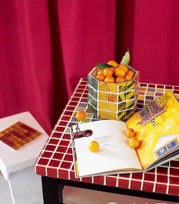 透明的馬賽克可以用來做燭臺,因?yàn)闋T光能夠透過馬賽克朦朦朧朧灑出來,又不似透過普通玻璃那樣直白。還有實(shí)用的紙巾盒、花瓶都可以用馬賽克來制做,一樣的餐桌不一樣的風(fēng)情。