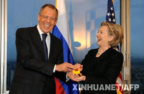 3月6日,在瑞士日內瓦,美國國務卿希拉里·克林頓(右)與俄羅斯外長拉夫羅夫在出席雙邊會談時同時按下一個紅色按鈕。這個有紅色按鈕的小裝置是希拉里送給拉夫羅夫的禮物。按鈕上方寫有俄文“負擔過重”,下方寫有英文“重啟”字樣。希拉里當日在結束與拉夫羅夫的會談后表示,這次會談是美俄雙邊關系的一個新開端。 新華社/法新