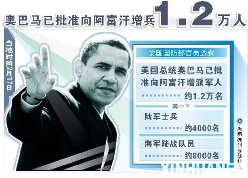 2009年2月18日 圖表:奧巴馬已批準(zhǔn)向阿富汗增兵1.2萬人 新華社發(fā)
