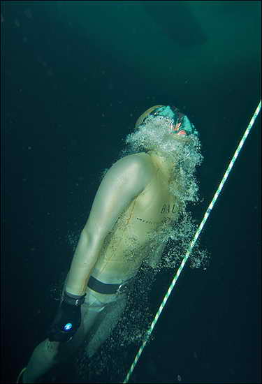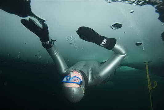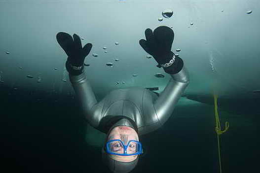 每名潛水者冒著零下二度的寒冷天氣,潛入一個(gè)3米乘3米的冰洞里,試圖下潛至冰面下最深處,他們屏住呼吸的時(shí)間為三至五分鐘,冰面下的能見(jiàn)度只有20米。潛水者試圖抵達(dá)挪威盧特瓦恩湖湖底。盧特瓦恩湖是一個(gè)淡水湖,深度為53米。