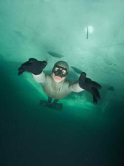 攝影師達(dá)恩-布爾頓稱(chēng):“這是世界首個(gè)冰下自由潛水比賽,這不是一個(gè)很輕松的挑戰(zhàn)。我們都只穿著一件濕式潛水衣,冒著大雪走了近3.2公里才到達(dá)比賽舉行地點(diǎn),所以,這是一個(gè)很艱難的挑戰(zhàn)?!?