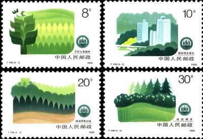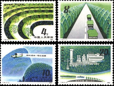 1980年3月12日,即我國第一個植樹節(jié),原郵電部發(fā)行《植樹造林,綠化祖國》特種郵票,全套4枚,第一枚“經(jīng)濟林”,面值4分;第二枚“四旁綠化”,面值8分;第三枚“飛播造林”,面值10分;第四枚“廠礦綠化”面值20分;1990年3月12日,即我國第十一個植樹節(jié),原郵電部發(fā)行《綠化祖國》特種郵票,全套4枚,第一枚“全民義務植樹”,面值8分;第二枚“城市綠化美化”,面值10分;第三枚“建設綠色長城”,面值20分;第四枚“林茂糧豐”,面值30分。兩套植樹造林郵票,圖案都以不同層次的綠色為基調,清新淡雅的畫面,將人們從喧囂的世界中帶入了一個綠色、靜謐的世界,令人賞心悅目,心曠神怡。