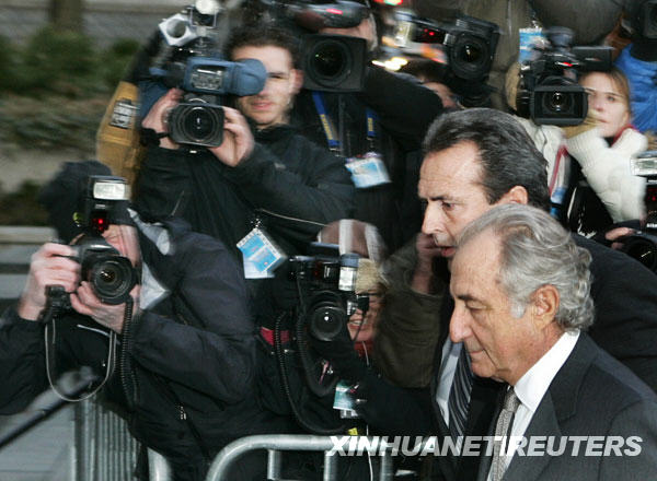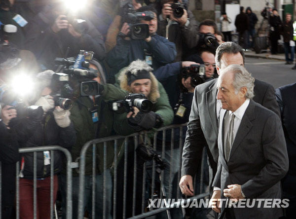 3月12日,在美國(guó)紐約,美國(guó)巨額金融詐騙案嫌疑人伯納德·麥道夫(右)抵達(dá)聯(lián)邦法庭準(zhǔn)備出庭。麥道夫的律師艾拉·索金10日在法庭上說,麥道夫擬于12日聽證會(huì)上對(duì)全部11項(xiàng)罪名指控承認(rèn)有罪。他可能因此面臨最高150年監(jiān)禁。 新華社/路透