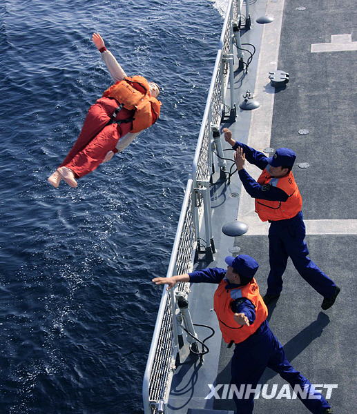 3月12日,中國海軍“廣州”號驅(qū)逐艦水兵在***海投放模擬“落水人員”?!昂推剑?9”多國軍演當(dāng)日進(jìn)行了海上聯(lián)合搜救演習(xí)。新華社記者查春明攝