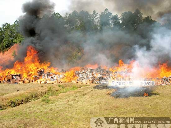 當(dāng)天上午9時(shí)30分,在南寧市五象嶺一空地,30多名工人在貨車上卸假煙,一輛吊車在起吊大箱的煙草,幾名工人配合吊車作業(yè)。附近幾百平方米的空地上擺放著大量假冒偽劣煙草,儼然成了一座小“煙山”。這些假煙中有中華、紅河、玉溪、555和紅塔山等幾十個(gè)品牌。幾名工人往“煙山”上潑柴油。30分鐘后,8大車假劣煙草被卸完。上午10時(shí)40分,幾名煙草專賣人員點(diǎn)燃了“煙山”。為防止出現(xiàn)意外,工作人員跑到附近山頭全程監(jiān)督,定時(shí)匯報(bào)情況。