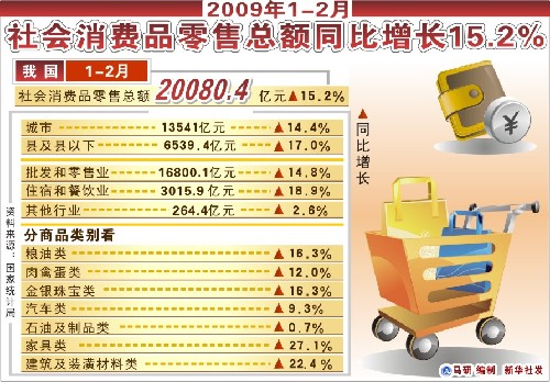 圖表:2009年1-2月社會(huì)消費(fèi)品零售總額同比增長(zhǎng)15.2% 新華社發(fā)