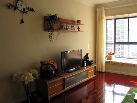 不喜歡電視背景墻就沒做 墻面是多樂士的雪中百合,網(wǎng)購電視柜是紅蘋果,喜歡墻上的隔板。沙發(fā)是掌上明珠,看著厚實,其實蠻輕飄。地板安信的鐵蘇木,打折時買的,顏色真是紅彤彤。茶幾和電話幾是迪諾雅的,家具差不多買齊了才發(fā)現(xiàn)這個牌子,實木的很簡潔。