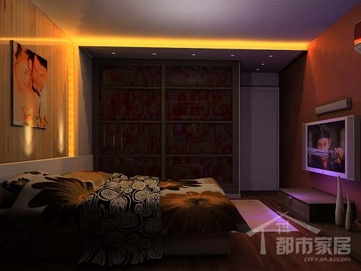 鐵銹紅色的電視背景墻,杏色的壁紙前后呼應(yīng),同樣的暖色系列,卻增添了些許原始的野性味道。配合同樣暖色的床品,整個(gè)臥室渾然一體,既溫馨、甜膩,又有幾分神秘的色彩。