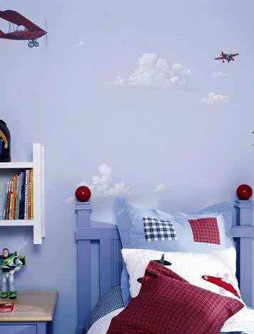 天藍色的背景,生動的傳達了一個小男孩想插上夢想的翅膀。墻壁上栩栩如生的畫著天空的云彩和飛機,每朵云和每架飛機都是形態(tài)各異的。藍色的家具融入在藍色的背景里。床邊的白色架子是收藏故事書絕佳的地方。