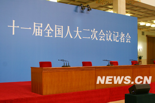 2009年3月13日,十一屆全國(guó)人大二次會(huì)議在京閉幕。國(guó)務(wù)院總理***在閉幕會(huì)后會(huì)見(jiàn)中外記者。今年記者會(huì)的現(xiàn)場(chǎng)與往年有一個(gè)明顯的不同,主席臺(tái)上沒(méi)有布置鮮花和綠植,簡(jiǎn)潔的桌面讓人一目了然。圖為記者會(huì)現(xiàn)場(chǎng)。馬軼群 攝