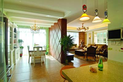 客廳的主題墻為真皮飾面,真皮飾面的沉實(shí)色調(diào),透過(guò)客廳、餐廳的兩盞水晶吊燈變得柔和瑰麗,呈現(xiàn)出莊嚴(yán)的大宅風(fēng)貌;淺色的仿古磚地面,再配襯以精心挑選的布藝家私,頓時(shí)讓略顯古板的空間平添生機(jī);客廳、餐廳的隔而不斷,相互呼應(yīng),營(yíng)造出交錯(cuò)變化的空間感。同時(shí)大氣的棕黃色與明快的亮白色形成鮮亮的對(duì)比,使業(yè)主能瞬間體會(huì)移步換景的感覺(jué)。
