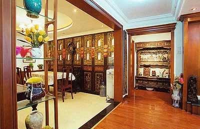 如果獨(dú)立柱柜距離壁不遠(yuǎn),可采用以木板或矮柜把穹與墻壁連成一體。柱壁板可以掛畫或花草來作裝飾,而矮柜則可令視野通透,增加景深,沒有沉悶閉塞之感。