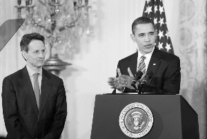 16日,奧巴馬(右)及美財(cái)長蓋特納會見中小企業(yè)代表 新華社圖片