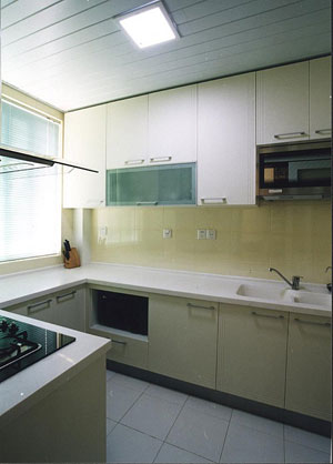 2.廚房的水槽和燃?xì)庠钌戏揭b燈。