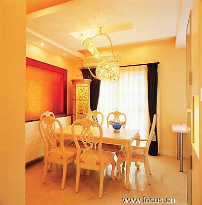 盡管奢華的歐式風(fēng)情四處可見,但主人還是選擇了一些其他地域的元素,以體現(xiàn)自己的個(gè)性。最引人注意的就是那些燈具,基本上都很富麗堂皇,但形狀很豐富,功能也很討巧,比如餐廳頂部的那只巨大的***式的酒壺?zé)?,造型華麗,構(gòu)思巧妙。而餐桌邊上的一只花格柜子,有清晰的印度特色,與餐臺(tái)上的玻璃器皿相映成趣。