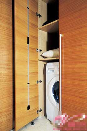 需要時(shí)將洗衣機(jī)直接推出即可,不用時(shí)隱藏在壁柜中,關(guān)上柜門,空間依然整潔有序,整體居室風(fēng)格得到很好的保持。