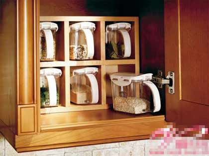 木質(zhì)儲(chǔ)物格本款櫥柜十分注重收納細(xì)節(jié),打開吊柜的門板,里面的木質(zhì)六格儲(chǔ)物架透出細(xì)膩的光澤,按調(diào)料瓶的尺寸量身定制,增加了儲(chǔ)物的空間。