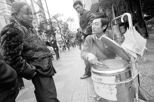 2月16日,重慶,從大學(xué)房地產(chǎn)專業(yè)畢業(yè)的曾天才賣了3年房子后,走上街頭,賣起了玉米。曾天才說:“大學(xué)畢業(yè)賣玉米,我并不覺得是一件難堪的事情,而是對自己的一種歷練。我想學(xué)一門技術(shù),以后自己創(chuàng)業(yè)?!?圖片來源:重慶晨報(bào)