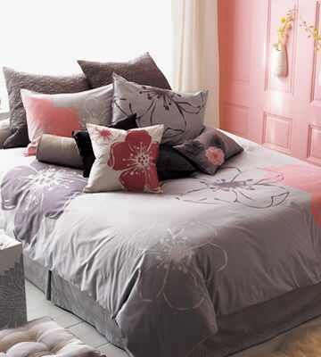 緋紅與粉紅,將花朵綻放在床品的局部。灰的背景與白的調(diào)和,使嬌媚的粉趨于雅致。立體花朵裝飾靠墊,粉墻上黃色插花,讓外面的生機(jī)蔓延至屋內(nèi)。