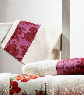大花的底布鋪設(shè)了浪漫的基調(diào)。鑲嵌花朵的毛巾隨意地斜搭和疊放,為自然氣息的房間帶來了怡人的田園風(fēng)情。長(zhǎng)絨毛的柔和觸感染上了詩意的色彩。