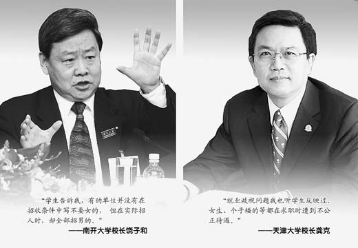 今年兩會(huì)期間,全國人大代表、南開大學(xué)校長饒子和特地返校同2009屆畢業(yè)生們開了一場就業(yè)座談會(huì)。讓他沒想到的是,在《就業(yè)促進(jìn)法》實(shí)施一年多之后,仍有不少女同學(xué)向他反映就業(yè)歧視問題。當(dāng)天,正好是“三八”國際勞動(dòng)?jì)D女節(jié)。