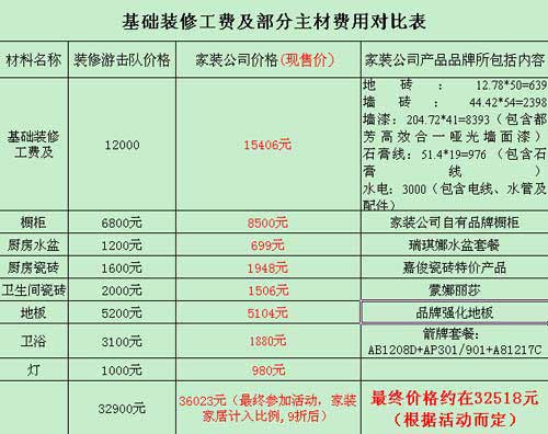 到底家裝公司與家裝游擊隊(duì)之間的報(bào)價(jià)存在多大的差距呢?隨后,記者與戴先生拿著戶型圖找到了京城某知名家裝公司請(qǐng)?jiān)O(shè)計(jì)師為戴先生做一份報(bào)價(jià)。戴先生與設(shè)計(jì)師經(jīng)過溝通以后,將自己的心理價(jià)格告之設(shè)計(jì)師,雙方很快達(dá)成一致,一天過后,設(shè)計(jì)師為戴先生提交了一份報(bào)價(jià)單。記者將這份報(bào)價(jià)單與戴先生家裝修隊(duì)的報(bào)價(jià)進(jìn)行了對(duì)比,通過家裝建材套餐的整合,家裝公司名牌主材和專業(yè)施工的最終報(bào)價(jià)為36023元,適逢該公司促銷9折活動(dòng),最終定價(jià)為32518元。