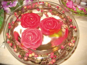 透明的玻璃缸里漂浮著3朵玫瑰,鑲邊則襯有紅色的果實(shí),整個就是一幅美景。湊近去聞,有一股蠟燭的清香味。稍稍移動玻璃缸,玫瑰隨水左右漂移。試想,如果點(diǎn)上蠟燭,燭火在水中搖曳,真是妙不可言了。