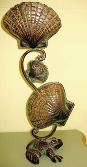 三片大小不一的扇貝鑲嵌在一根桿上,底座則是一只趴著的蟾蜍。據(jù)店主介紹,這可都是銅制的。你找到擱蠟燭的地方了嗎?就在第一個扇貝的殼里。這款燭臺比較適合古樸的裝修風(fēng)格。